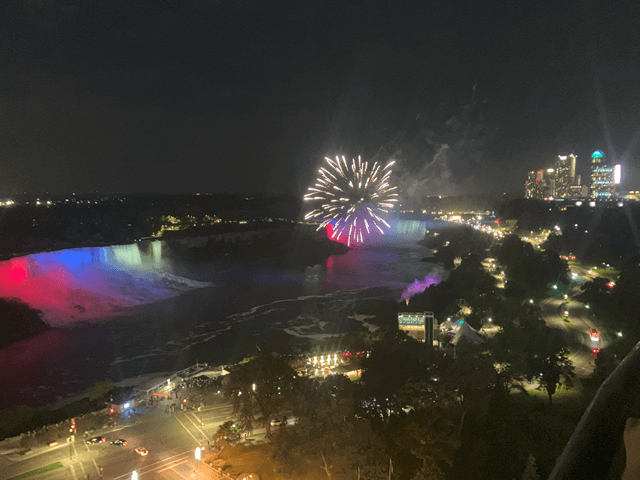 あと、ナイアガラはカナダ側で1泊するとこのようにイルミネーションや花火も見れますので、時間がある方はトロントからの日帰りにせず、是非宿泊していってもらえればと思います。ちなみにこちらはシェラトンでNUAを使い、ベランダ付きの部屋にアップグレードさせて部屋からみていました。