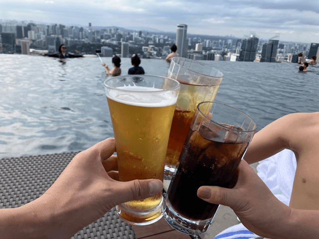 さて、現地ではオーチャードのマリオットに2泊滞在したのち、マリーナベイサンズに1泊しました。やはりここのプールは別格です。というのも、実は妻と初めての海外旅行(2012年の春)がシンガポールで、当時まだできて間もないマリーナベイサンズに宿泊しました。あの頃は若くて往復JALの夜行便エコノミーでいったのに昼から夜まで遊びまくっていました。そんな思い出の地で、家族3人でここで乾杯できたのはとてもうれしいことです。