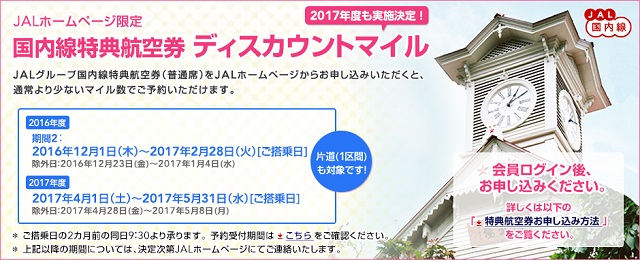 国内線のディスカウントマイルは、JALのHPから申し込んだ人限定、期間限定で必要マイル数が往復で2000~3000マイル減少するキャンペーンになります。さらに、JALカード保有者で往復(2区間)の特典航空券を発券する場合は、さらに追加で500マイル減少します。