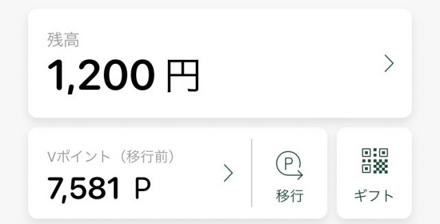 例えば、Vポイントが1,000ポイントあったとして、これをアプリ(プリペイド)にチャージすると、1,200円分がチャージされます。先ほどのカードからのチャージのキャンペーンと異なり 実際の交換の仕方ですが、Vポイントアプリの【移行】をまずタップします。