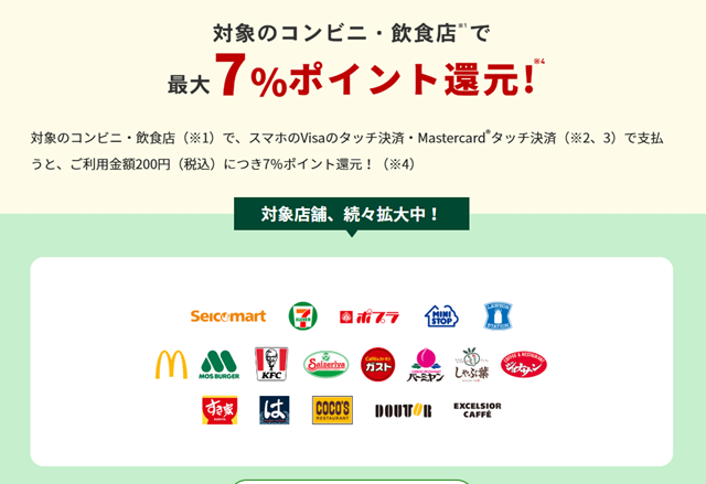ただ、セブンイレブンやローソン、マクドナルドやモスバーガー、ガストやすきや、ドトールやエクセルシオールで利用する場合は、スマホのコンタクトレス決済をすると還元率が常時7%に跳ね上がります。コンビニをよく使う人にとっては神のようなクレジットカードです。