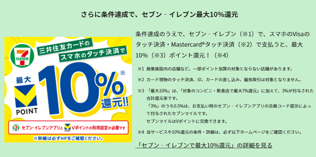 さらに、セブンイレブンでは、セブンイレブンのアプリとVポイントの連携を行い、会計時にセブンイレブンのアプリを提示した後、スマホのコンタクトレス決済を行うと10%還元になります。アプリとかちょっとめんどくさいですが、セブンイレブンをよく使われる方はやる価値があると思います。