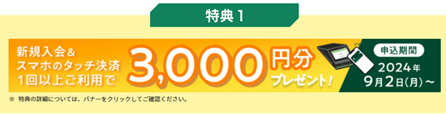一つ目のキャンペーンは、カードを発行し、スマホでのタッチ決済を1回利用するだけで3,000ポイントもらえるというものです。これはもう楽勝ですね