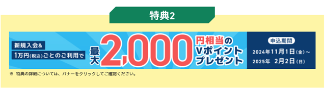 2つめの特典が、1万円ごとの利用で、1,000円相当のVポイントがもらえるというものです。NLの場合は最大2,000円相当のVポイントなので、2万円以上の利用で2,000ポイントがもらえるキャンペーン、と言い換えることもできます。