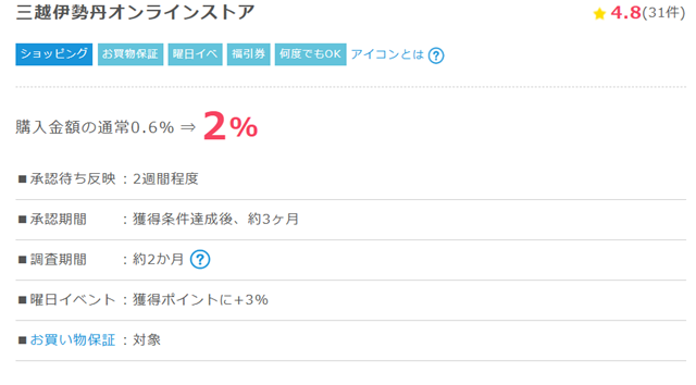 また、オンラインで購入する場合に忘れてはいけないのはポイントサイトを通すこと。三越伊勢丹オンラインは、各種ポイントサイトに案件がありますので必ず通しましょう。メジャーなポイントサイトで一番ポイントが高いのがポイントインカム(2%)かなと思います。モッピーが1.6%、ハピタスは1.2%などとなっています。