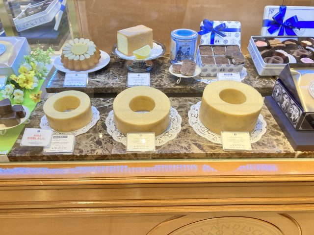 お値段ですがは、左側にある一番小さいサイズで1,512円です。ちなみに伊勢丹新宿店では、毎日16時に一番小さいサイズのバウムクーヘンを、切りたてで販売しています。その隣にあるバウムクーヘンが3,240円で、贈答用などだとこちらを選択することになるかなと思います。